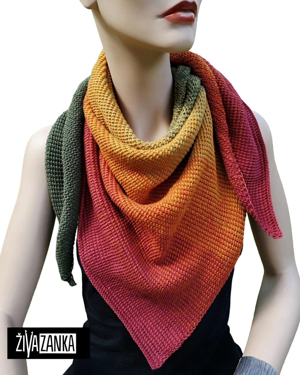 This unique street style triangle scarf is a statement piece due to a combination of color nuances that progress sideways and create a timeless magical look.