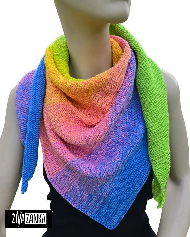 This unique street style triangle scarf is a statement piece due to a combination of color nuances that progress sideways and create a timeless magical look.