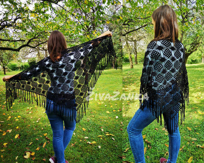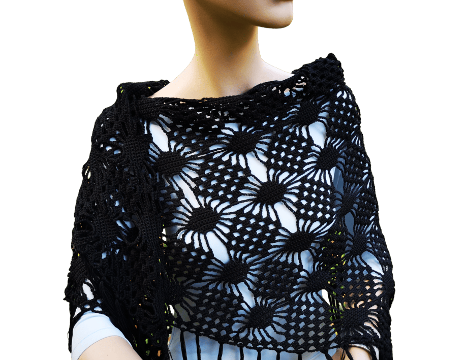 This large, comfy triangle shawl with fringes is wearable throughout the year. Its statement lace and black color create a bold, timeless and mysterious look. It is a versatile alternative fashion piece that will make a nice addition to various outfits. You can tie it around your neck, wrap it around your shoulders or even tie it around your waist over a swimsuit during summer.