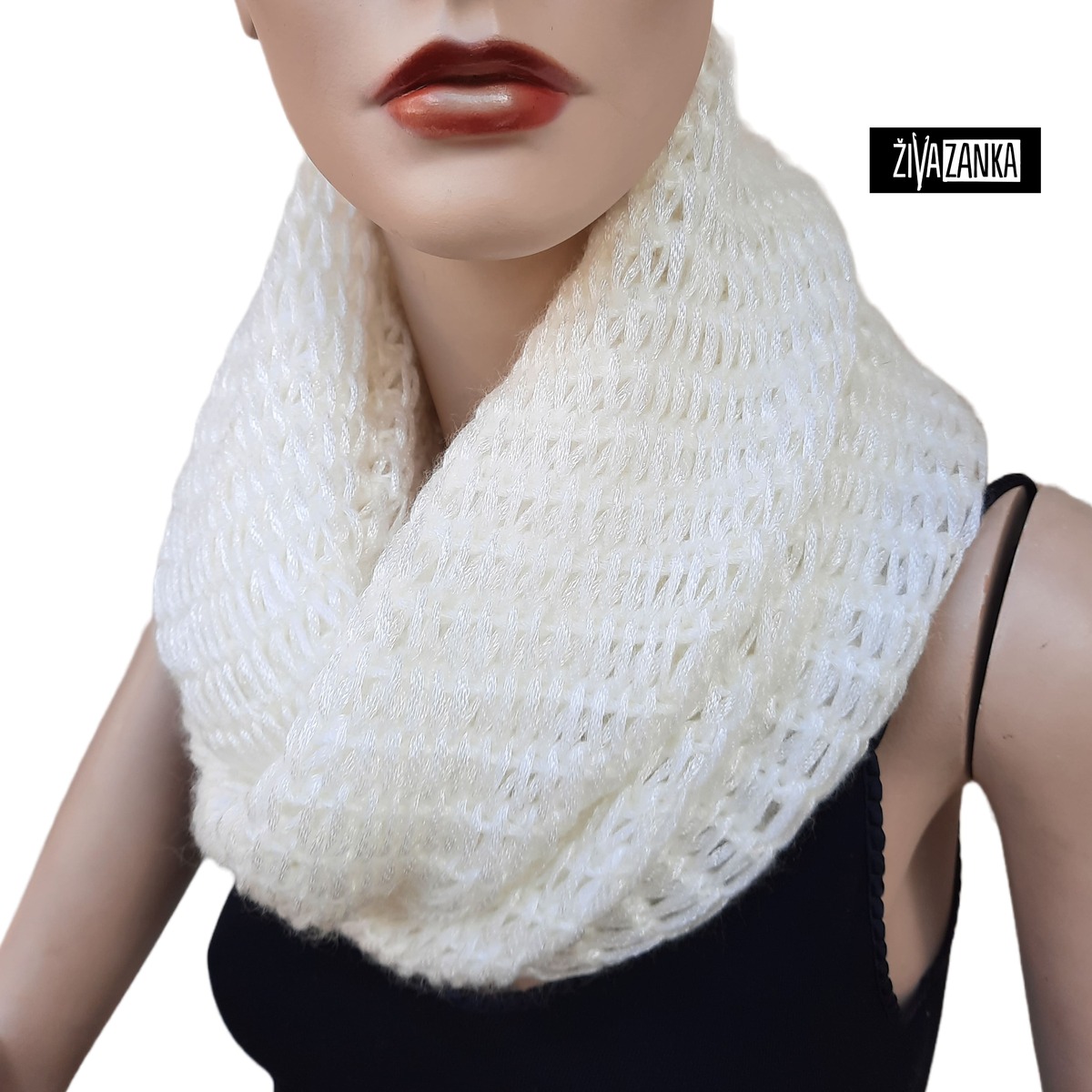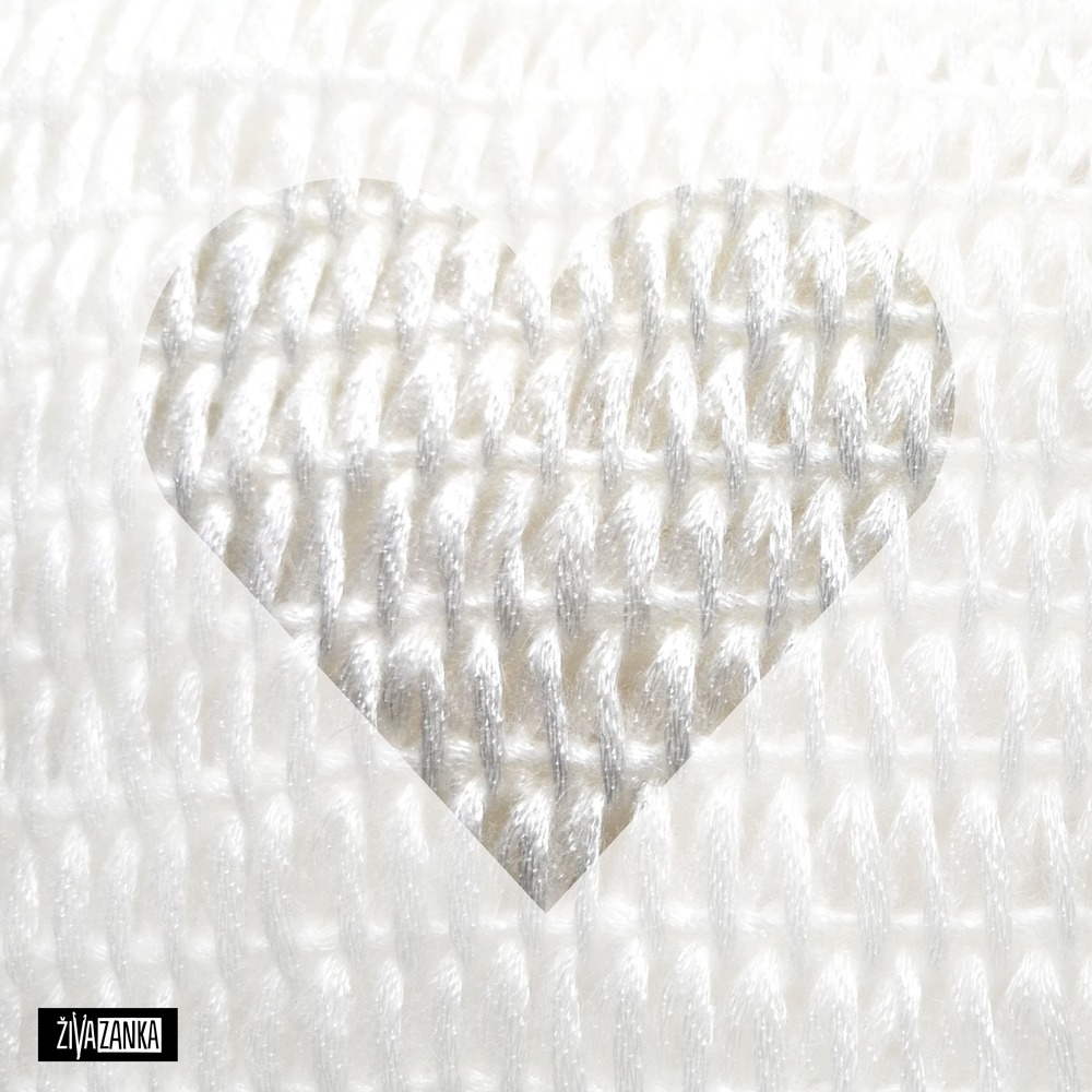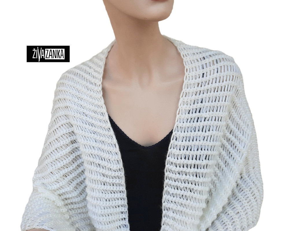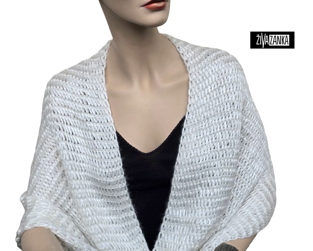 It was handmade from Oeko-Tex certified wool blend yarn (70% polyamide, 21% acrylic, 9% wool) in white color with pearly metallic shine.