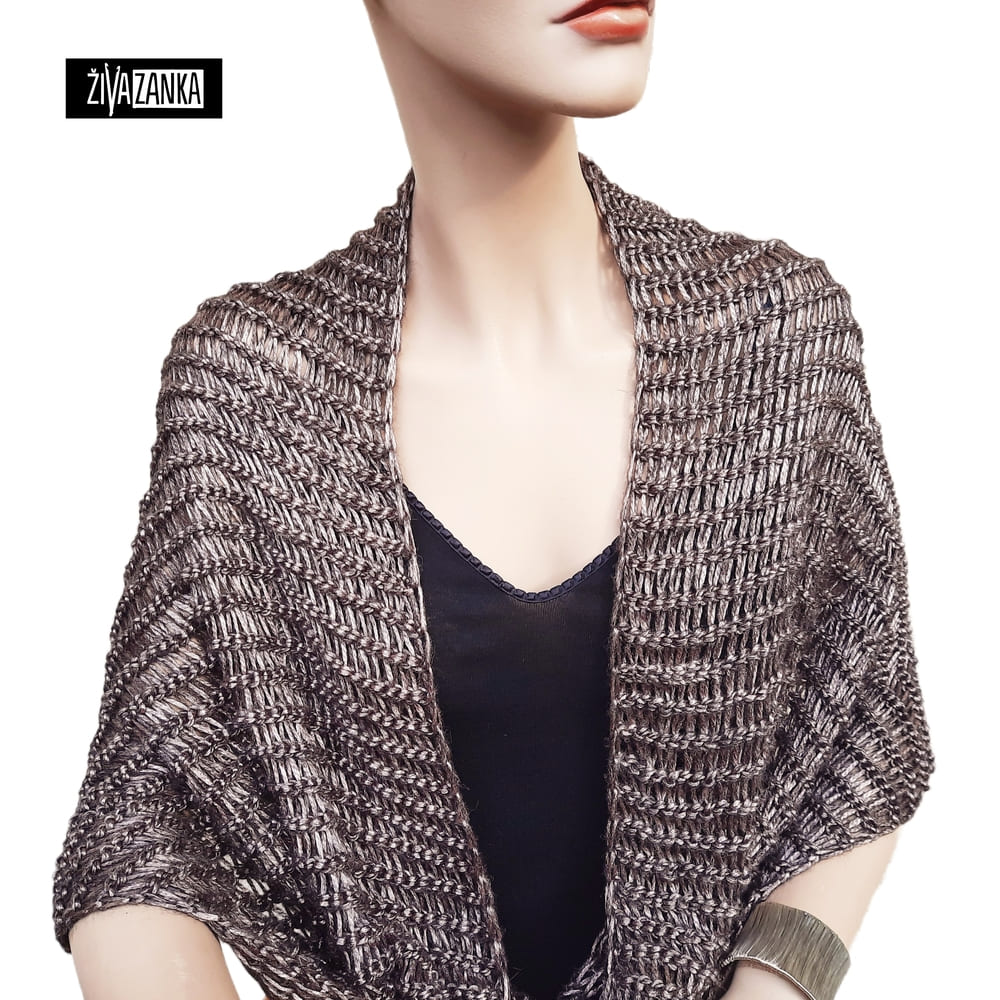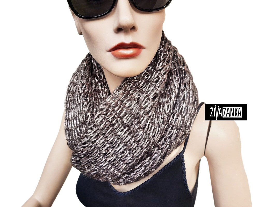 This is a 2in1 type of infinity scarf with two different looks depending on which side you turn it. It is wearable in several ways, indoors and outdoors, during the day and in the evening. You can wrap it around your shoulders, tie it around your neck once or twice (depending on the warmth you want), or you can also stretch it over your head as a hooded cowl. It is very soft, comfy and lightweight.